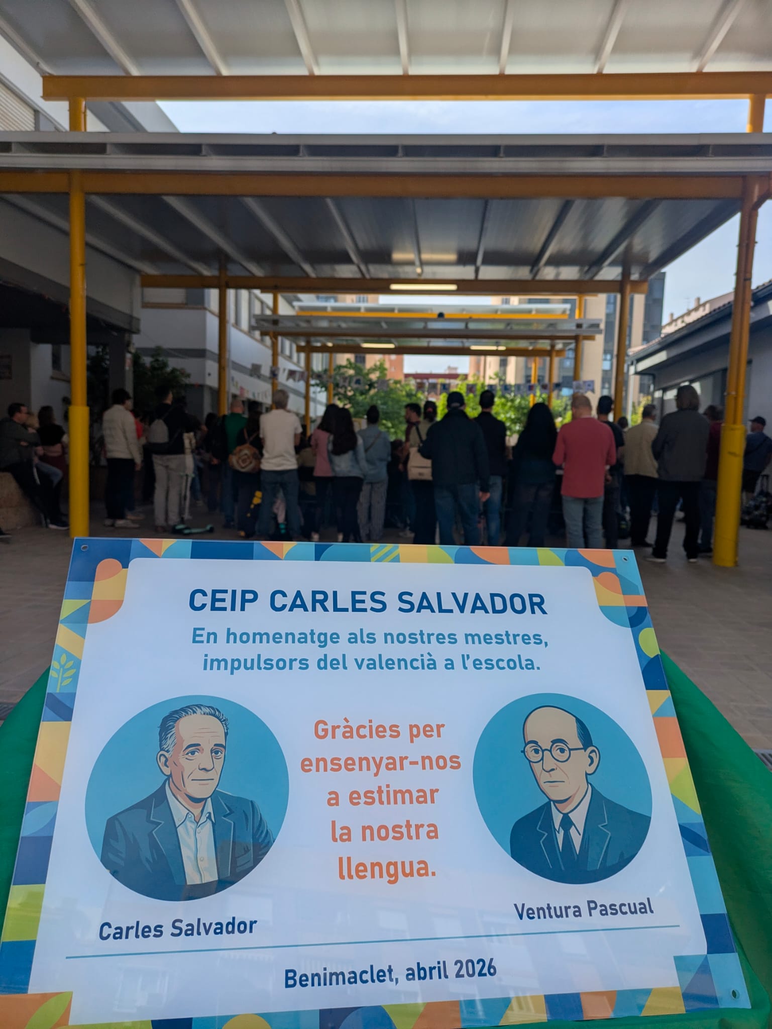 Gràcies a la nostra escola, l’equip directiu i les mestres, així com a la plataforma Carles Salvador, per fer-nos viure una vesprada tan bonica i per posar cadascuna el seu granet de sorra per a que totes i tots recordem el mestre de Benimaclet que estimava el valencià.